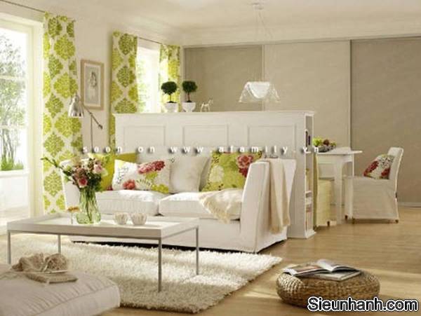 Phòng được thiết kế rất trang nhã với tông màu trắng chủ đạo khiến không gian trở nên rộng rãi, sáng sủa. Rèm cửa, gối tựa màu cốm non có kết hợp với hoa văn là điểm nhấn nhẹ nhàng cho căn phòng nhưng cũng không kém phần ấn tượng. Đến bình hoa trang trí cũng phù hợp với hoa văn trang trí đến mức hoàn hảo. Cửa sổ và cửa chính đều dùng chất liệu kính trong suốt, tận dụng hiệu ứng của ánh sáng tự nhiên để không gian khoáng đạt hơn.